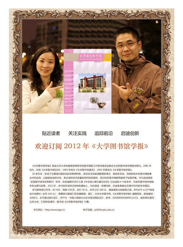 本刊邮局发行代号:82-692,每期128页,定价30元,全年订价180元,请读者到当地邮局订阅。本刊对个人订户继续实行优惠价(全年150元),需要者可直接汇款至编辑部。请汇:北京大学图书馆,《大学图书馆学报》编辑部收,邮政编码:100871。亦可通过银行信汇,开户行:中国工商银行北京市海淀西区支行,帐号:0200004509089131151,收款单位请写:北京大学。汇款附言请写:图书馆《大学图书馆学报》刊费。