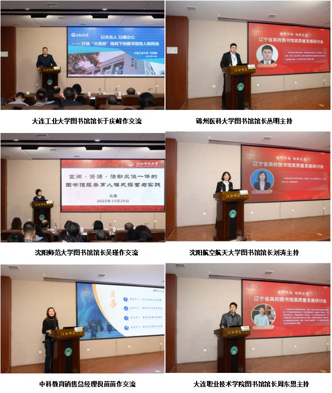 大连工业大学图书馆馆长于庆峰分享了“大思政”格局下,高校图书馆主动融入学校“立德树人”目标,打造育人新阵地的建设经验;沈阳师范大学图书馆馆长吴瑾全面深入介绍了沈阳师范大学图书馆空间、资源、活动三位一体服务育人模式的探索与实践;中科教育销售总经理倪苗苗以《AI赋能高校图书馆融合发展新生态》为题,依托资源整合和技术创新为图书馆服务转型注入新动能。锦州医科大学图书馆馆长丛明、沈阳航空航天大学图书馆馆长刘涛、大连职业技术学院图书馆馆长周东恩分别主持了这三场报告。
