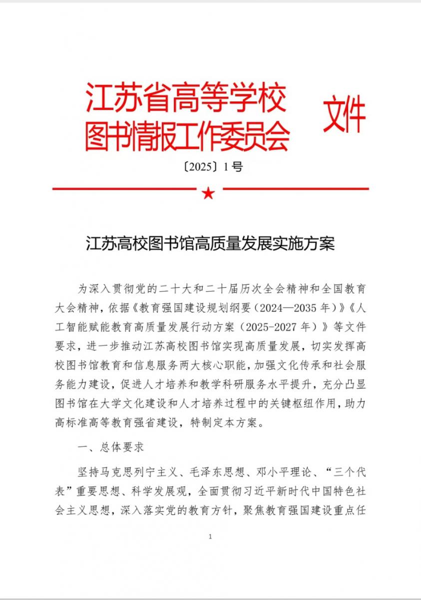 2025年10月31日,江苏省高等学校图书情报工作委员会正式印发《江苏高校图书馆高质量发展实施方案》(以下简称《方案》),旨在全面推动江苏省高校图书馆事业转型升级与高质量发展,助力高标准教育强省建设。